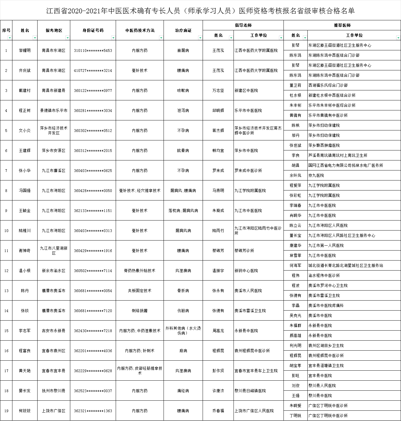 江西省2020-2021年中醫(yī)醫(yī)術(shù)確有專長(zhǎng)人員醫(yī)師資格(15號(hào)令)考核合格名單(第一批)
