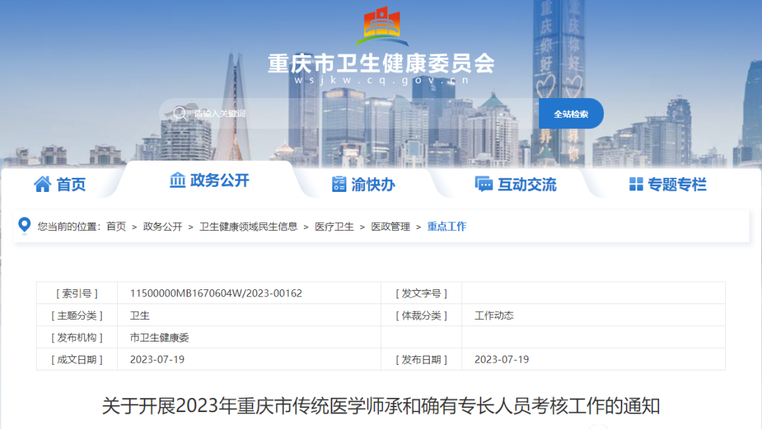 為加強全市傳統(tǒng)醫(yī)學師承和確有專長人員考核管理,根據(jù)《傳統(tǒng)醫(yī)學師承和確有專長人員醫(yī)師資格考核考試辦法》(衛(wèi)生部令第52號)(以下簡稱《52號令》)、《傳統(tǒng)醫(yī)學出師考核和確有專長考核實施方案(試行)》等規(guī)定,現(xiàn)將2023年重慶市傳統(tǒng)醫(yī)學師承和確有專長人員考核工作有關(guān)事項通知如下: