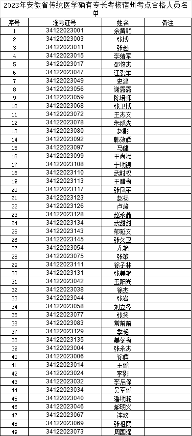 根據(jù)安徽省中醫(yī)藥管理局《關(guān)于2023年安徽省傳統(tǒng)醫(yī)學(xué)師承人員出師考核和確有專長人員考核工作的通知》要求,宿州市衛(wèi)健委于2023年10月21、22日組織實施了綜合筆試和實際本領(lǐng)考核。根據(jù)有關(guān)規(guī)定,現(xiàn)將考核合格人員名單予以公示(合格人員名單見附件),公示期自2023年11月6日-10日。在公示期內(nèi)如對考核合格人員持有異議,可以來電、來信反映