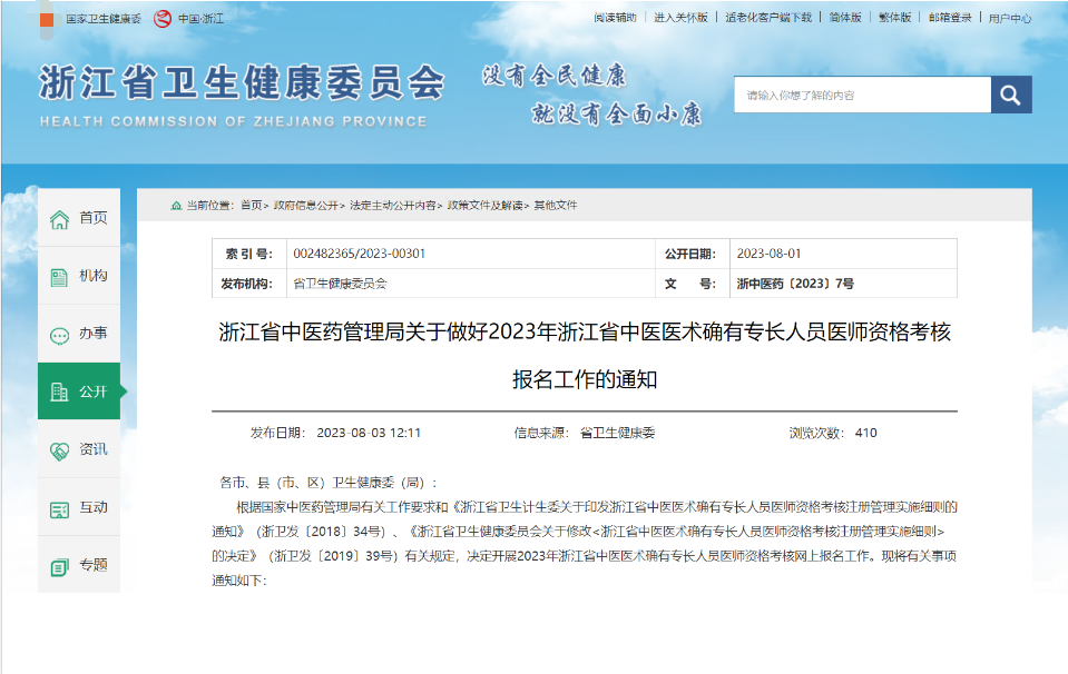 根據(jù)國家中醫(yī)藥管理局有關(guān)工作要求和《浙江省衛(wèi)生計(jì)生委關(guān)于印發(fā)浙江省中醫(yī)醫(yī)術(shù)確有專長人員醫(yī)師資格考核注冊管理實(shí)施細(xì)則的通知》(浙衛(wèi)發(fā)〔2018〕34號)、《浙江省衛(wèi)生健康委員會關(guān)于修改<浙江省中醫(yī)醫(yī)術(shù)確有專長人員醫(yī)師資格考核注冊管理實(shí)施細(xì)則>的決定》(浙衛(wèi)發(fā)〔2019〕39號)有關(guān)規(guī)定,決定開展2023年浙江省中醫(yī)醫(yī)術(shù)確有專長人員醫(yī)師資格考核網(wǎng)上報(bào)名工作?,F(xiàn)將有關(guān)事項(xiàng)通知如下: