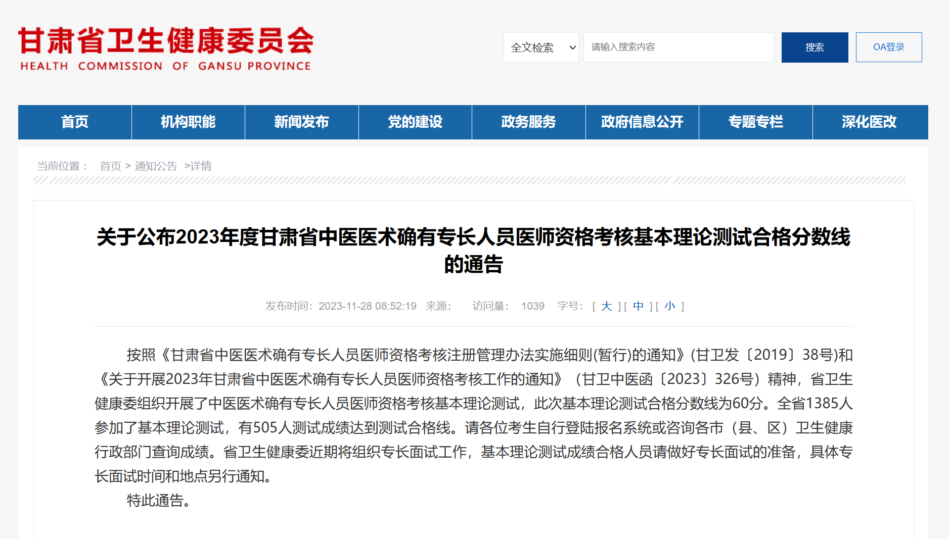 按照《甘肅省中醫(yī)醫(yī)術確有專長人員醫(yī)師資格考核注冊管理辦法實施細則(暫行)的通知》(甘衛(wèi)發(fā)〔2019〕38號)和《關于開展2023年甘肅省中醫(yī)醫(yī)術確有專長人員醫(yī)師資格考核工作的通知》(甘衛(wèi)中醫(yī)函〔2023〕326號)精神,省衛(wèi)生健康委組織開展了中醫(yī)醫(yī)術確有專長人員醫(yī)師資格考核基本理論測試,此次基本理論測試合格分數(shù)線為60分。全省1385人參加了基本理論測試,有505人測試成績達到測試合格線。請各位考生自行登陸報名系統(tǒng)或咨詢各市(縣、區(qū))衛(wèi)生健康行政部門查詢成績。省衛(wèi)生健康委近期將組織專長面試工作,基本理論測試成績合格人員請做好專長面試的準備,具體專長面試時間和地點另行通知。