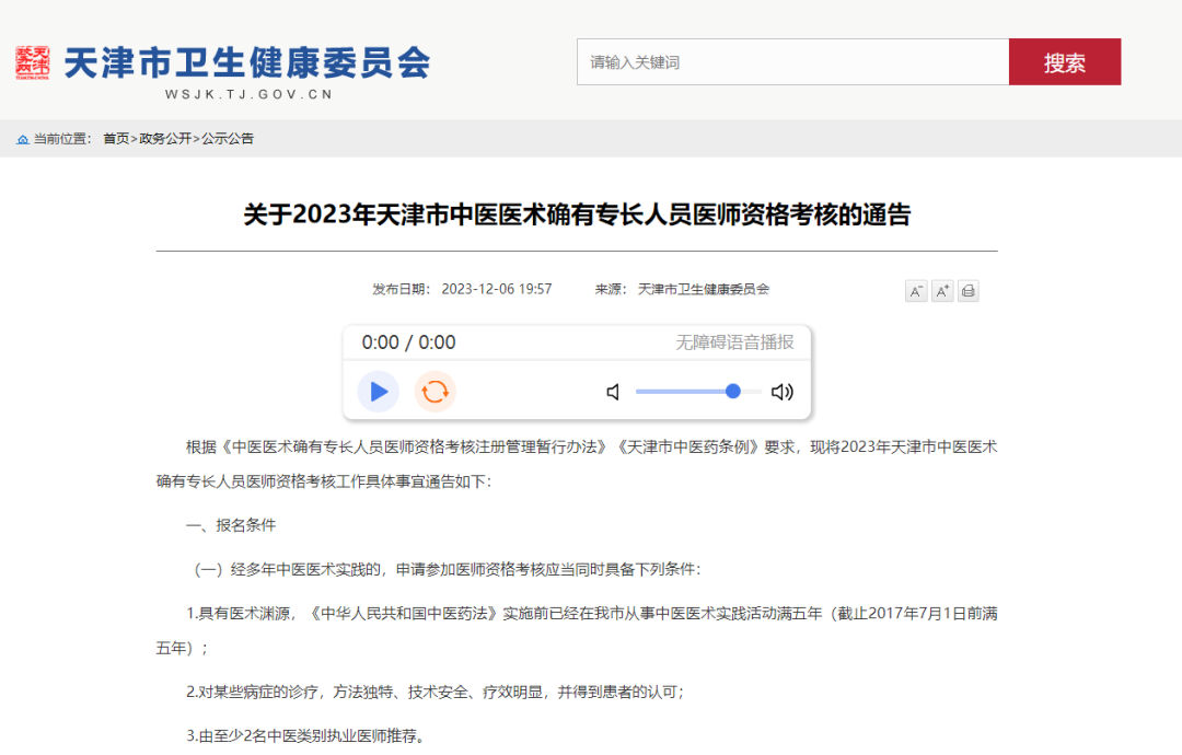 關(guān)于2023年天津市中醫(yī)醫(yī)術(shù)確有專長人員醫(yī)師資格考核的通告