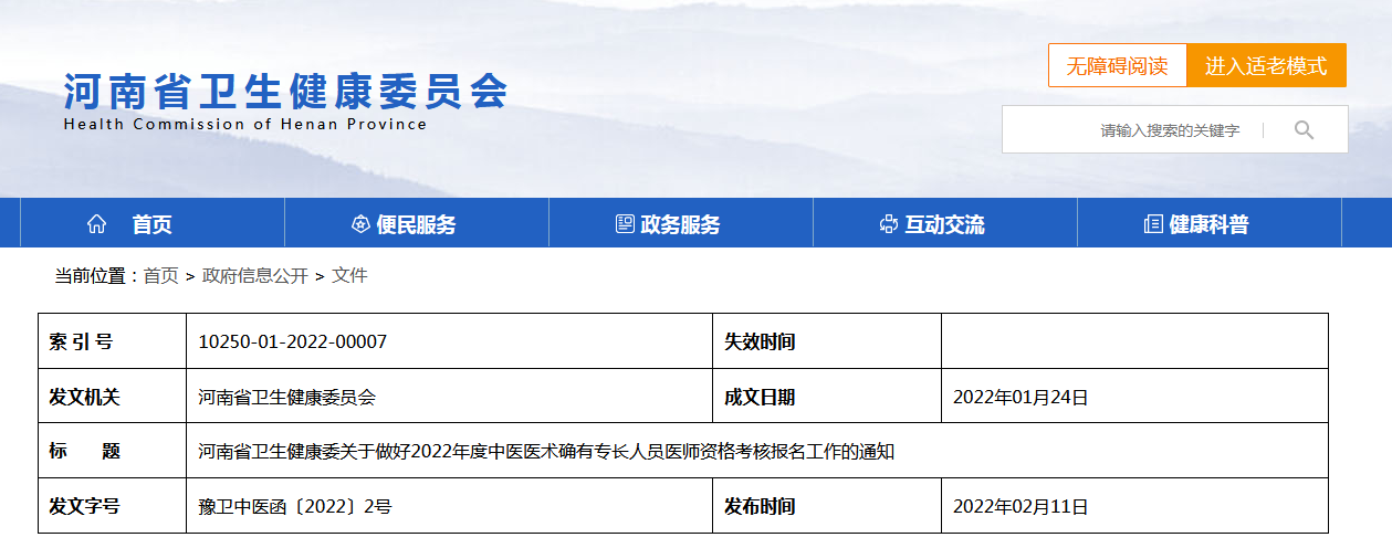 ![]() 河南省衛(wèi)生健康委關(guān)于做好2022年度中醫(yī)醫(yī)術(shù)確有專長人員醫(yī)師資格考核報(bào)名工作的通知 |