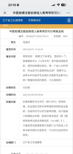 圖四所示為遼寧衛(wèi)健委答網(wǎng)友問,遼寧衛(wèi)健委明確的答復(fù)是:不能減少年限,也就是最開始提到的情況2,學(xué)歷入學(xué)時(shí)間與助理執(zhí)業(yè)滿五年雙符合條件。