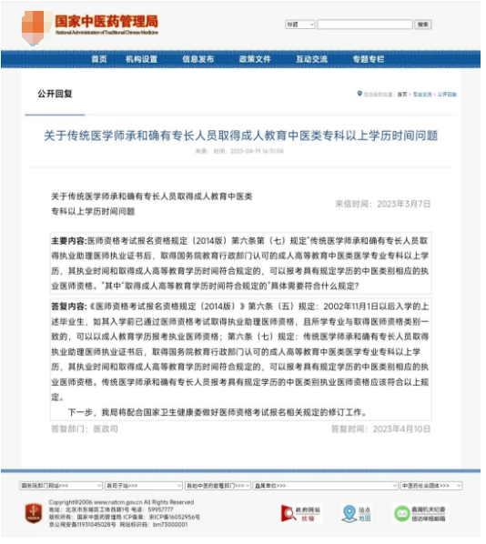 下面看國家中醫(yī)藥管理局的回復(fù),對(duì)于這個(gè)回復(fù),我的看法是:等于沒回復(fù)。筆者也知道后學(xué)歷要符合這項(xiàng)規(guī)定啊,但是對(duì)于年限問題,比如1月份畢業(yè)的三年成教和6月份畢業(yè)的2.5年成教,對(duì)于成人大專還是成人本科,對(duì)于是否要求專本學(xué)歷專業(yè)一致性問題,都沒有提及。是典型的用原文解釋問題。國家中醫(yī)藥管理局都不給明確答復(fù),地方上更不會(huì)正面答復(fù)你,只有等到報(bào)名時(shí)試了才知道。