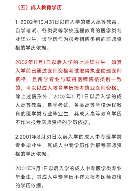 圖六來源于小紅書,從圖上信息看,可能是江蘇省的要求,這個(gè)要求與其他省有點(diǎn)區(qū)別,多了一條如果是成教專升本的話,必須有對(duì)應(yīng)專業(yè)的大專學(xué)歷打底,即專本一致;但如果用成人大專報(bào)的話,是否就能繞過專本一致的限制?至于是否需要同時(shí)滿足助理執(zhí)業(yè)滿五年,也未可知。但據(jù)江蘇省的嚴(yán)格程度來說,筆者對(duì)江蘇的規(guī)定不置樂觀態(tài)度,大概率不能縮短年限。但亦歡迎江蘇考友嘗試、反饋。