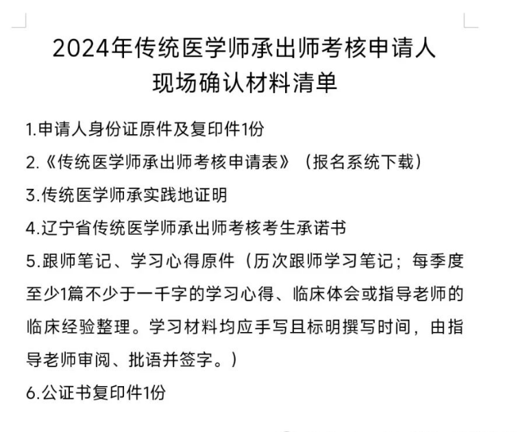 附件(可至遼寧省衛(wèi)健委官方網(wǎng)站下載):1.傳統(tǒng)醫(yī)學(xué)師承出師考核申請(qǐng)人現(xiàn)場(chǎng)確認(rèn)材料清單;2.傳統(tǒng)醫(yī)學(xué)師承實(shí)踐地證明;3.2024年傳統(tǒng)醫(yī)學(xué)師承出師考核考生承諾書(shū)